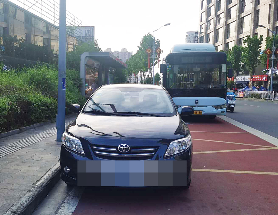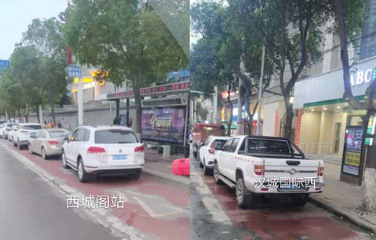 在金州廣場(chǎng)南站,十幾輛私家車(chē)“整齊劃一”的停在公交車(chē)站位置,地面紅色區(qū)域上的公交兩字也被完全覆蓋,從遠(yuǎn)處望去,站牌旁坐著幾個(gè)人正等待公交車(chē)的到來(lái)。在興華名城站,一輛私家車(chē)??吭诠卉?chē)站前,駛來(lái)的公交車(chē)無(wú)法按其規(guī)定進(jìn)站停車(chē)。在西城閣站和漢城國(guó)際西站,幾輛私家車(chē)甚是“任性”,儼然將公交車(chē)站當(dāng)成了“停車(chē)場(chǎng)”,筆者在此駐足十幾分鐘,它們依然“紋絲不動(dòng)”,有的車(chē)上甚至沒(méi)有車(chē)主。
